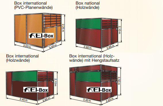 Zusätzlich zu den FEI-Standard-Boxen (3,00 m x 3,00 m) bieten wir Ihnen ein weiteres Boxenmodell (2,65 m x 3,45 m), das ebenfalls die 9 m 2 -FEI-Norm erfüllt.
