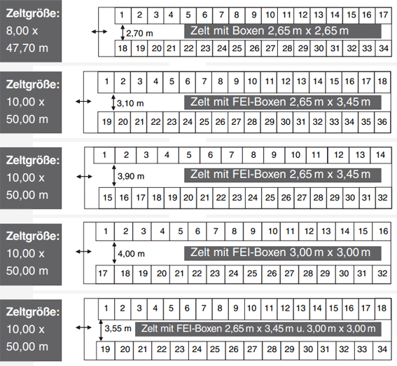 Durch diese „schlanken“ Modelle ist es Ihnen möglich, mehr Boxen im Zelt unterzubringen (siehe Stellsysteme rechts). Für nationale Events empfehlen wir Ihnen unsere Box 2,65 m x 2,65 m. Alle Boxen sind querbelüftet durch Fenster bzw. Gitter, unterstützt von den hohen Giebeln.